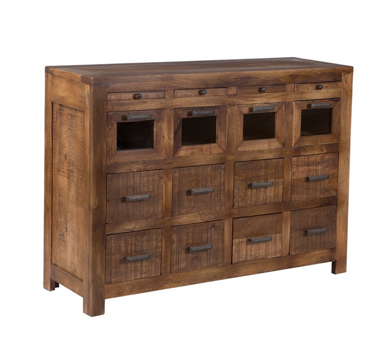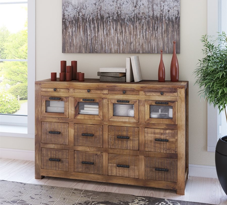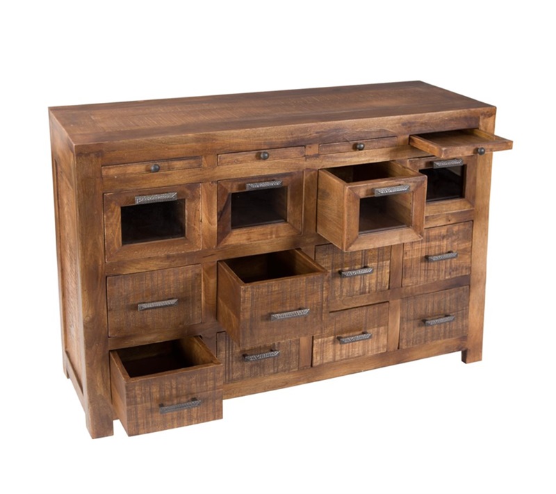This 12 drawer chest will add a warm touch to any home. Each drawer features bar hardware with a hand hammered design in a brushed dark brown finish. Four rececessed, pull-out shelves provide additional serving space. Every piece of furniture is handcrafted by skilled artisans which makes no two items exactly alike. The different types of wood, materials, hardware and finishes used to create these beautiful pieces creates slight imperfections that brings character and a unique story to each piece. Anti-Tip hardware is recommended for this item. Disclaimer: Not intended for the storage of clothing.