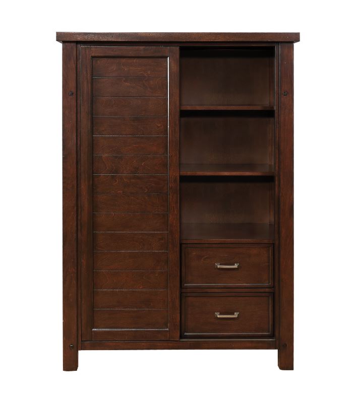Add convenient storage and glamorous style to your bedroom decor. This gorgeous door chest boasts a stunning finish of rich pinot noir accentuated by striking metal drawer handles. Subtle, carved lines on its cabinet door add a pleasing accent to its simple silhouette. This chest features six large drawers on the left and a spacious cabinet on the right. It allows plenty of space to accommodate your extensive wardrobe.