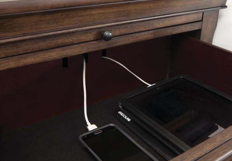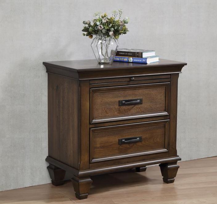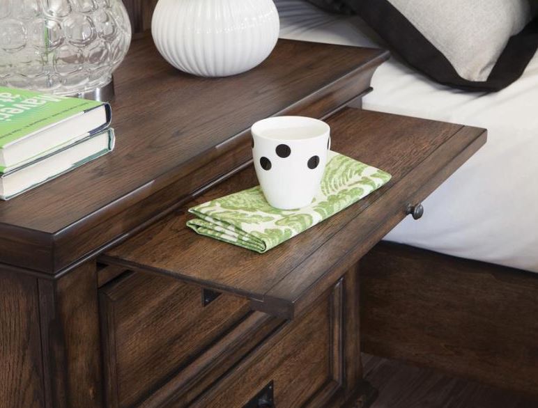 Radiate subtle rustic charm throughout a classic motif with this modern two-drawer nightstand. With features like a pull-out service tray and cord access for charging electronics, this nightstand is full of contemporary updates. The warmly hued drawer fronts feature a burnished oak finish and operate with self-closing glides. Sleek and elongated, the dark hardware helps to streamline the timeless silhouette.