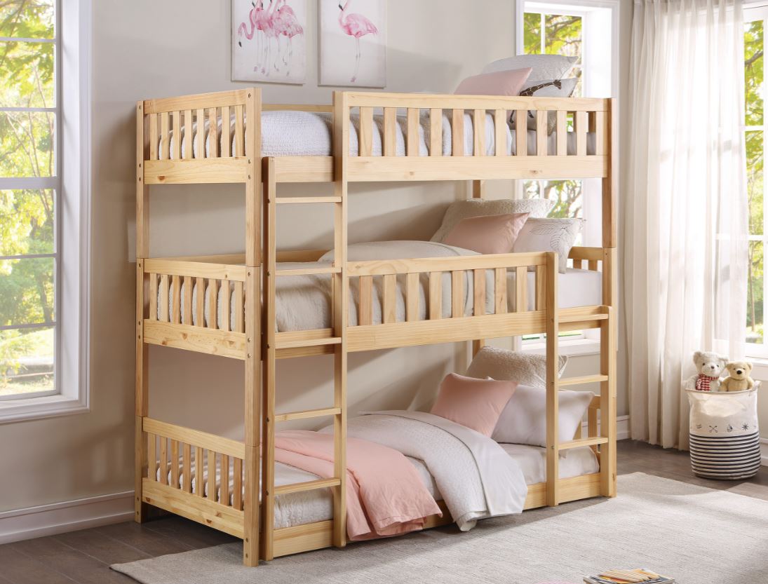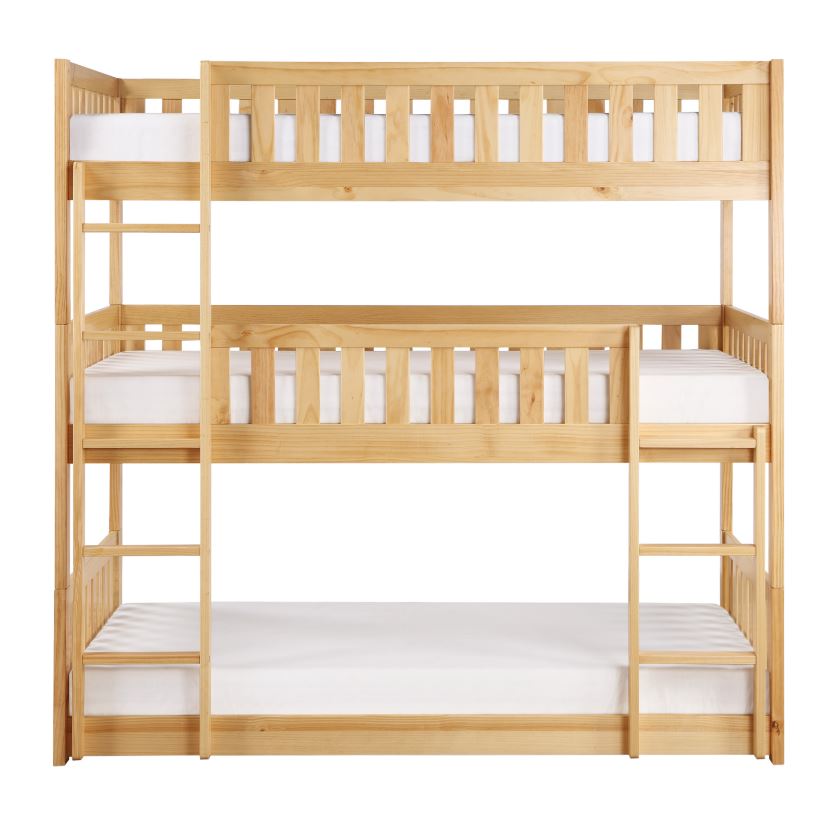 Maximizing sleep space is achieved with the stylish Bartly Collection. This transitional triple twin bunkbed is featured in a natural pine finish making it an appropriate choice for a number of youth bedroom settings. The three sleep platforms start at floor level and work their way up via an attached ladder system.