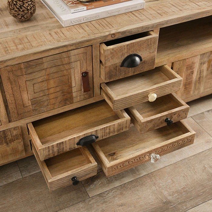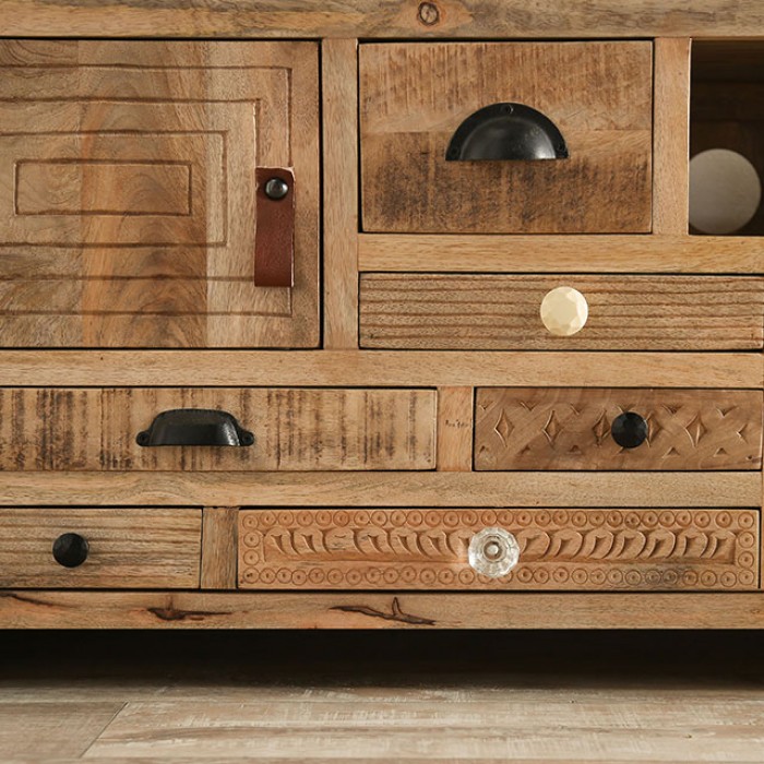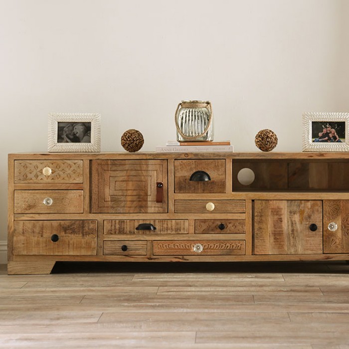 Fancy variations are the highlight of this piece. There are a total of nine drawers, each with their own handcrafted design and assorted hardware. Place your electronics on the open shelf with built-in easy-access for your wirings. The console may have a low profile, but it has plenty to enjoy for anyone with an eclectic taste in furniture.