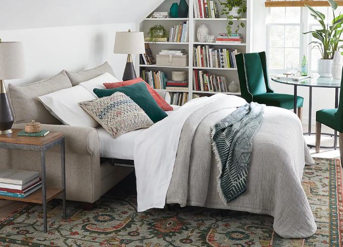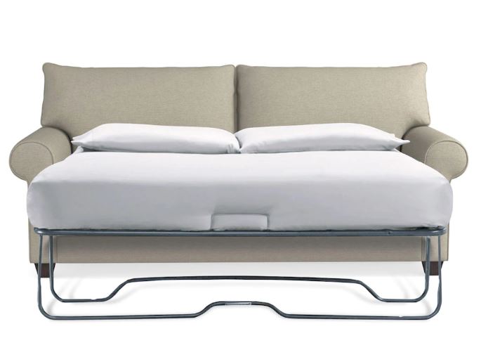 The design of the Alexander with Roll Arm queen sleeper sofa is pure classic: sock-styled arms, loose cushions, tapered walnut legs, and welted cushion seams. The look, however, is all yours: Choose from hundreds of fabrics, finding the color and texture perfect for your room. We invite you into our stores to discover even additional customization options for your sofa. The sofa will keep up with your family for years to come, supported by an interlocking hardwood frame. Dimensions: W85\\\", D37\\\", H39\\\".