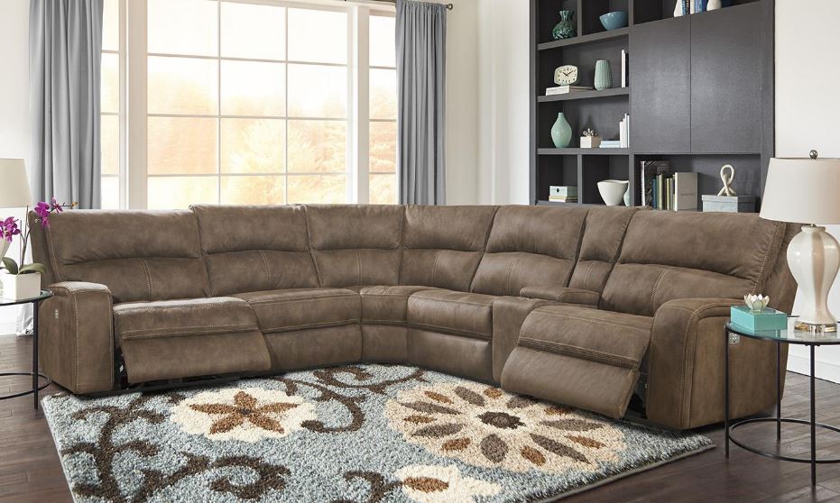 Beautiful warm kahlua color in 100% polyester material. Very easy to keep clean and maintain. Power recliner & head rest and us charging port. Also available in modular sectional.