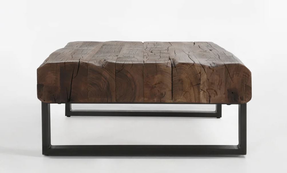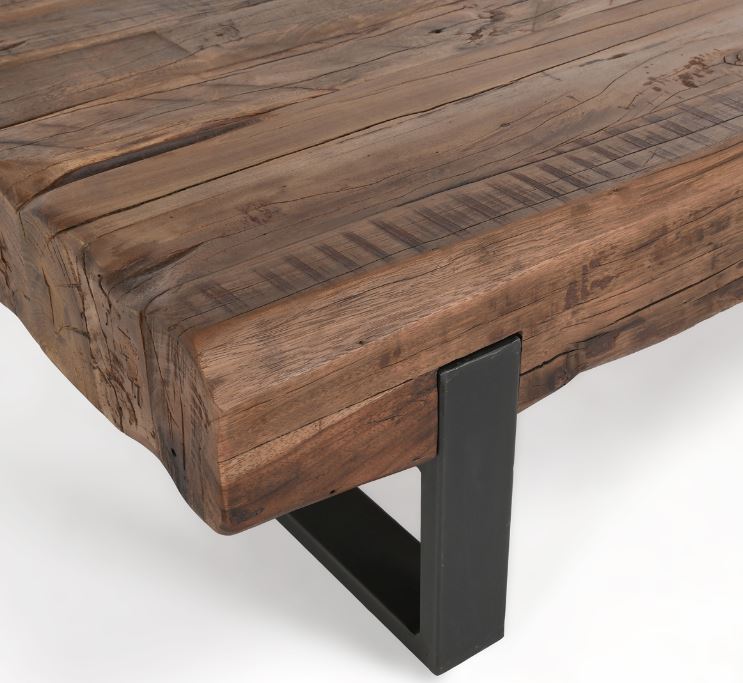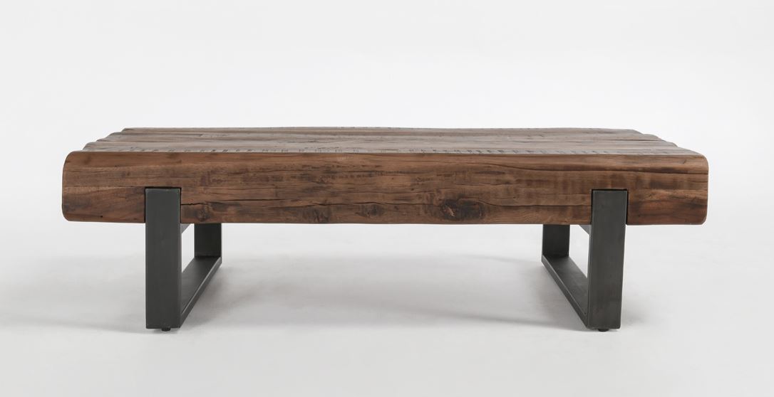Reclaimed materials bring distinctive energy to any space when crafted into a sophisticated piece such as this coffee table. Thick beams of wood lend rugged texture within the angular metal frame. Pair with matching pieces for a cohesive effect.