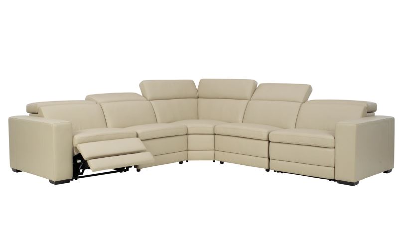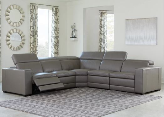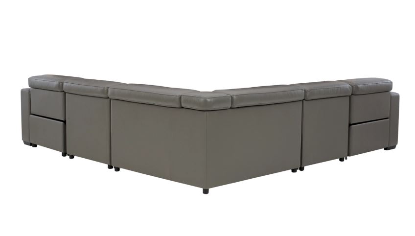 Truly putting high design into recline, this 5-piece sectional with genuine leather seating area proves that just because you’re a recliner doesn’t mean you have to look like one. Deceptively beautiful, its ultra clean-lined aesthetic is as cool and contemporary as they come. Low-profile back has a super swank look. When you need more support for your head and neck, the press of a button engages the Easy View™ power adjustable headrest, designed to let you lean back and still have a primo view of the TV. The zero wall design requires minimal space between wall and chair back, and indulgent pillow top seating gives an added layer of comfort.