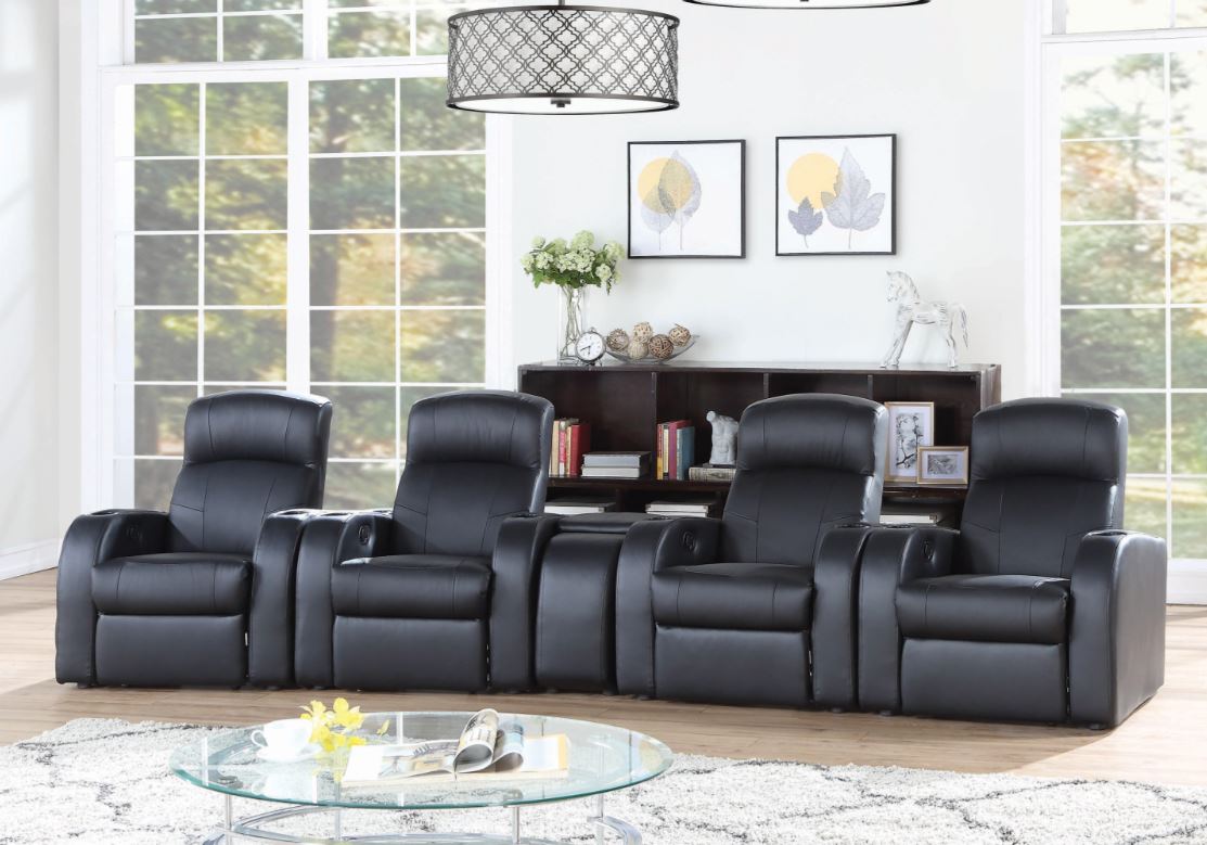 Get the movie theater experience at home with this set of recliners. Customize your home theater with your choice of seating configuration, available in numerous options. Optional center consoles offer unique storage for remotes and small items. Each top grain leather recliner is designed with its own cup holder for your favorite beverage. These black recliners are bound to improve your home theater experience and comfort levels.