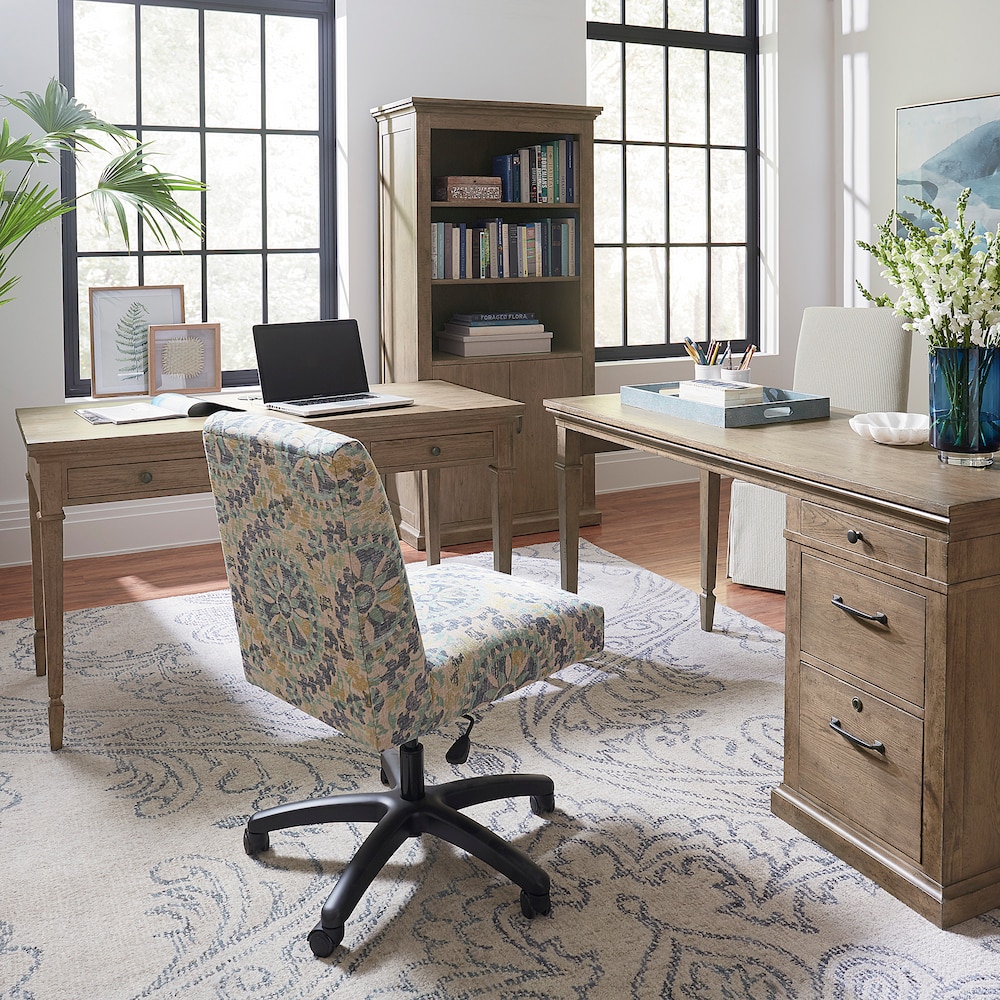 Working from home becomes a thing of beauty with the relaxed Sheridan Desk with File Cabinet. With its subtle crown molding and plinth base, this desk looks great from any side. Every practical design detail is built right in, including a side drawer a with pencil tray, standard drawer, and locked file drawer for letter or legal files. Craftsmanship shows in the English dovetail joinery and full extension ball bearing drawer slides. With its fresh, casual Dakota finish, oak veneer, and antique pewter hardware, the Sheridan Desk with File Cabinet is an updated classic. Place the file cabinet on the right or the left. Dimensions: W62", D25", H31.5".